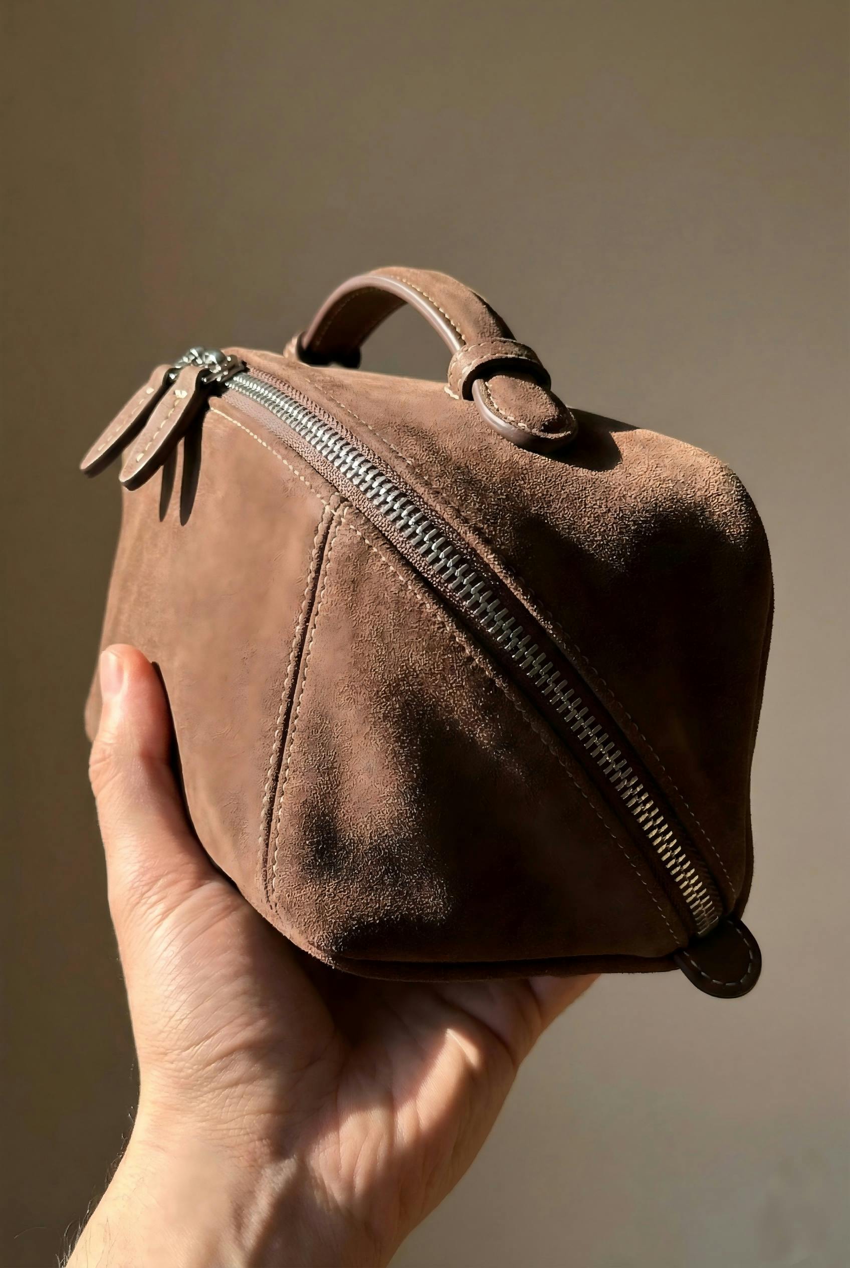 Camel leather makeup bag for travel, large capacity handheld cosmetic bag.