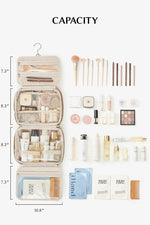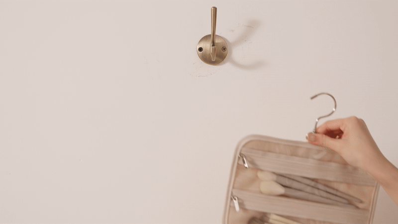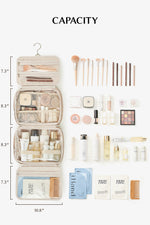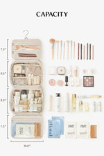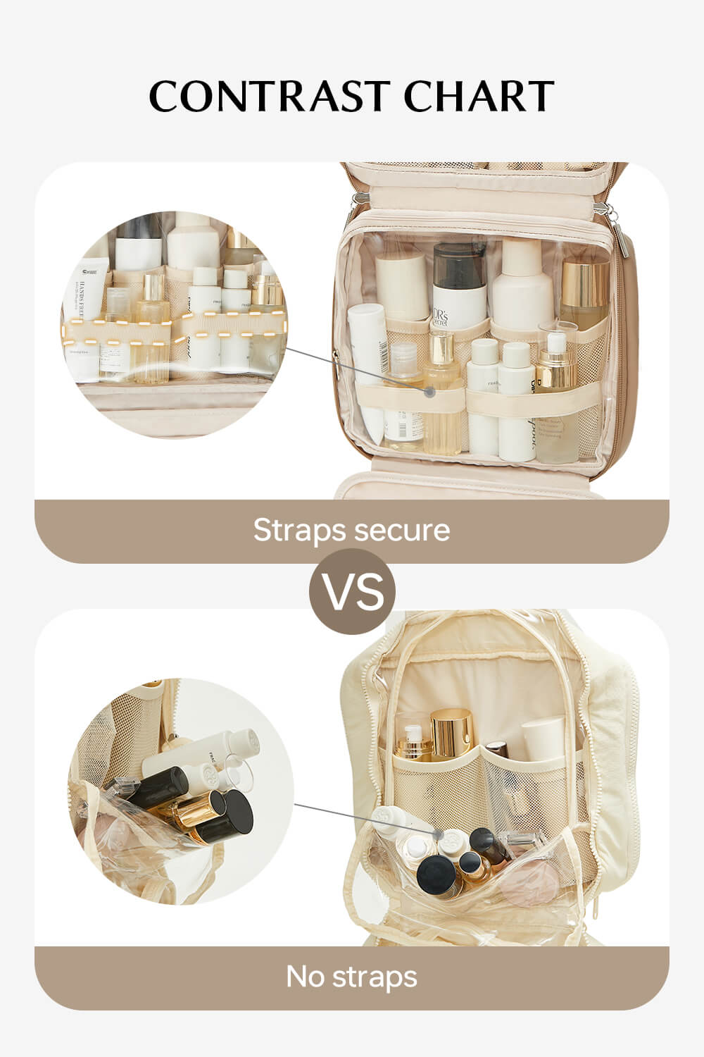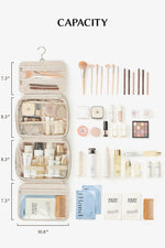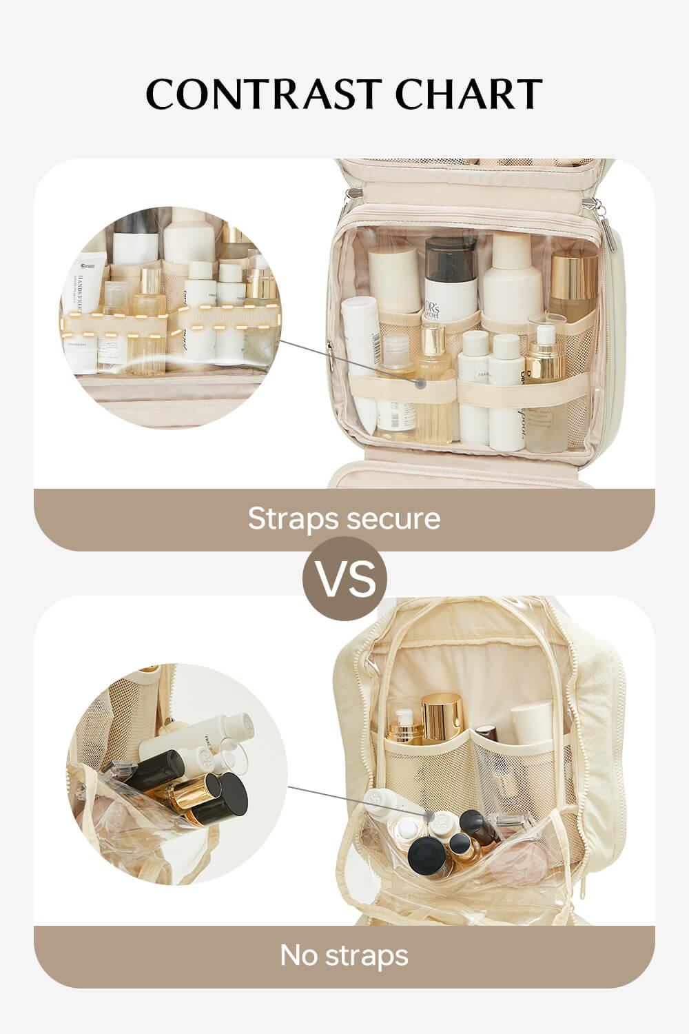 Designed with a sturdy 360° metal hook, the bag hangs securely on bathroom rods, hotel doors, or closet racks. This keeps your essentials upright, organized, and within easy reach—saving counter space and making travel routines effortless.