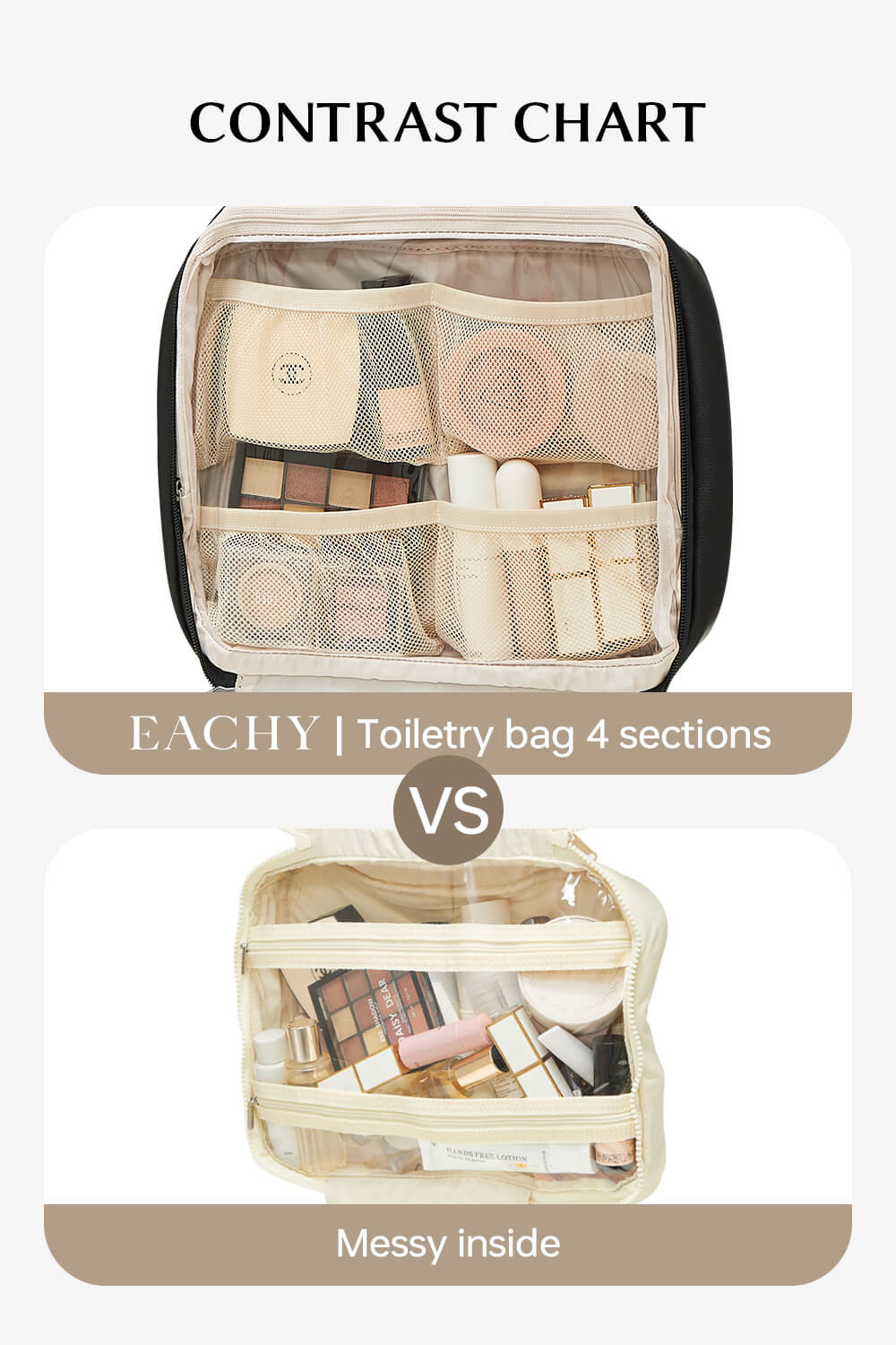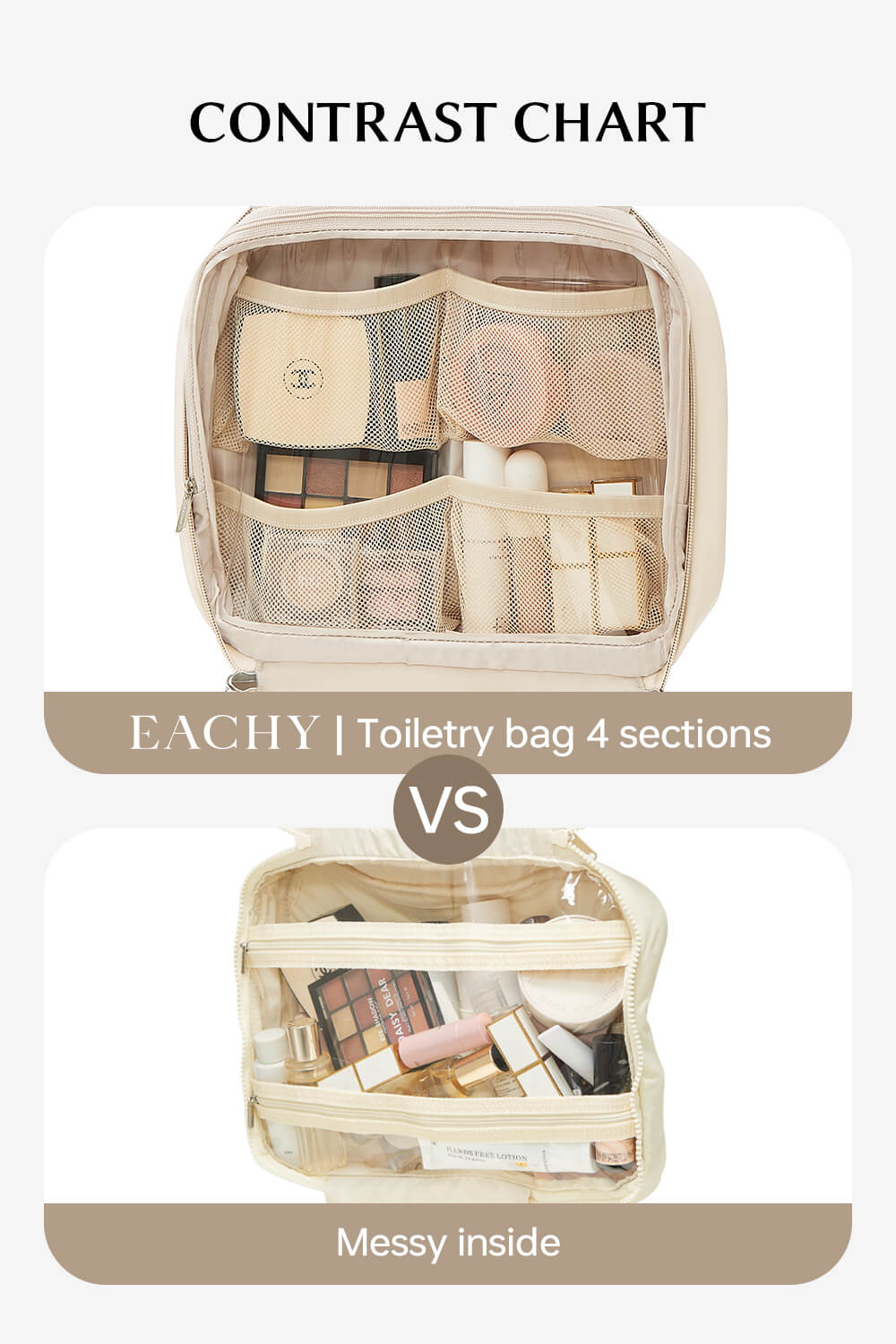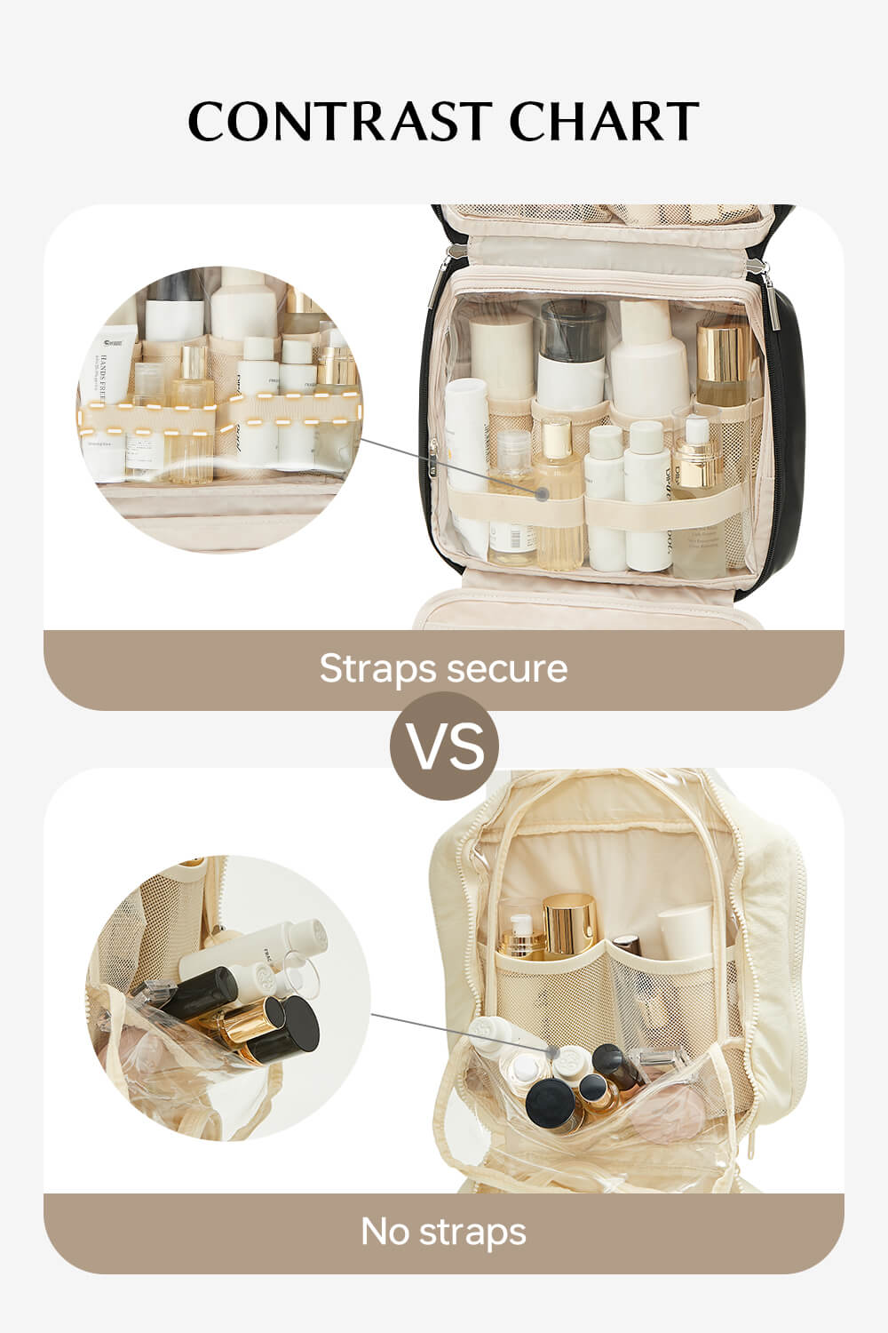 Designed with a sturdy 360° metal hook, the bag hangs securely on bathroom rods, hotel doors, or closet racks. This keeps your essentials upright, organized, and within easy reach—saving counter space and making travel routines effortless.