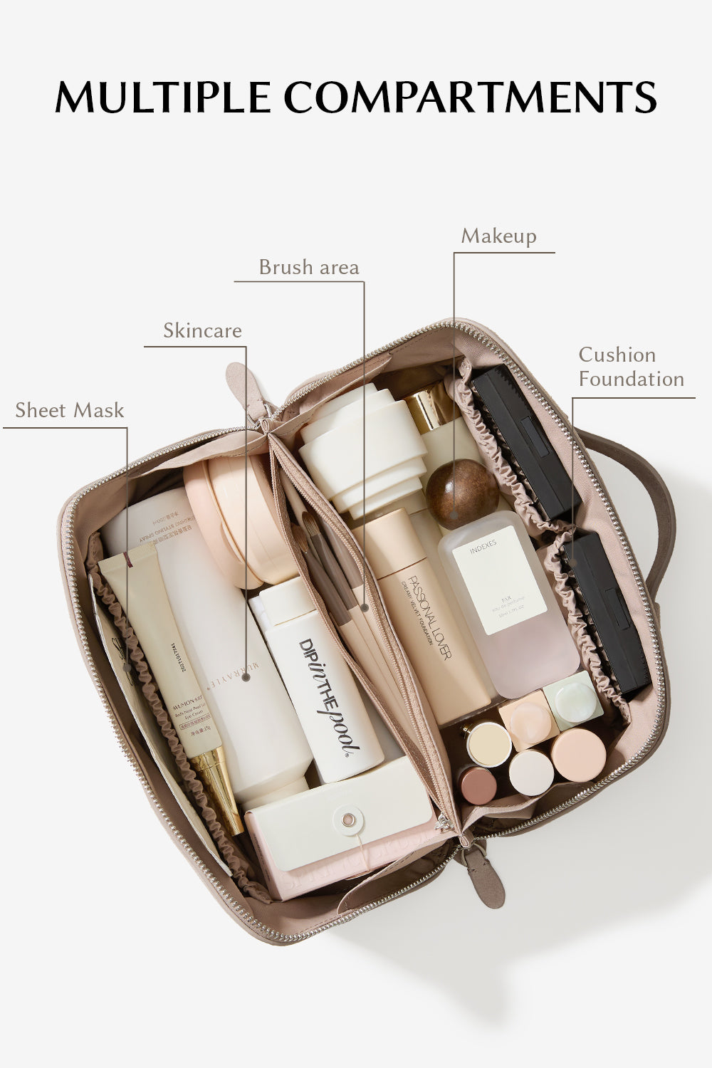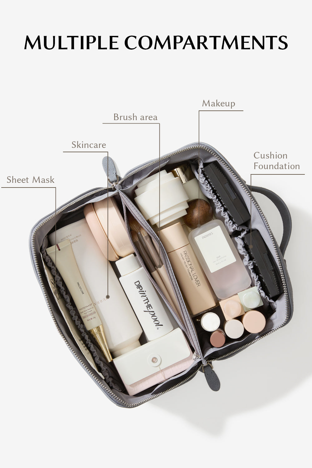 180° lay-flat opening gives you a full view inside. With compartments and a built-in brush holder, everything—from lipsticks to clips and eyeliners—stays in place, saving time with no digging.